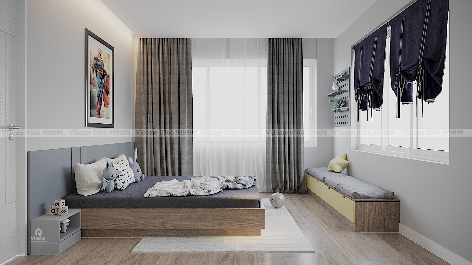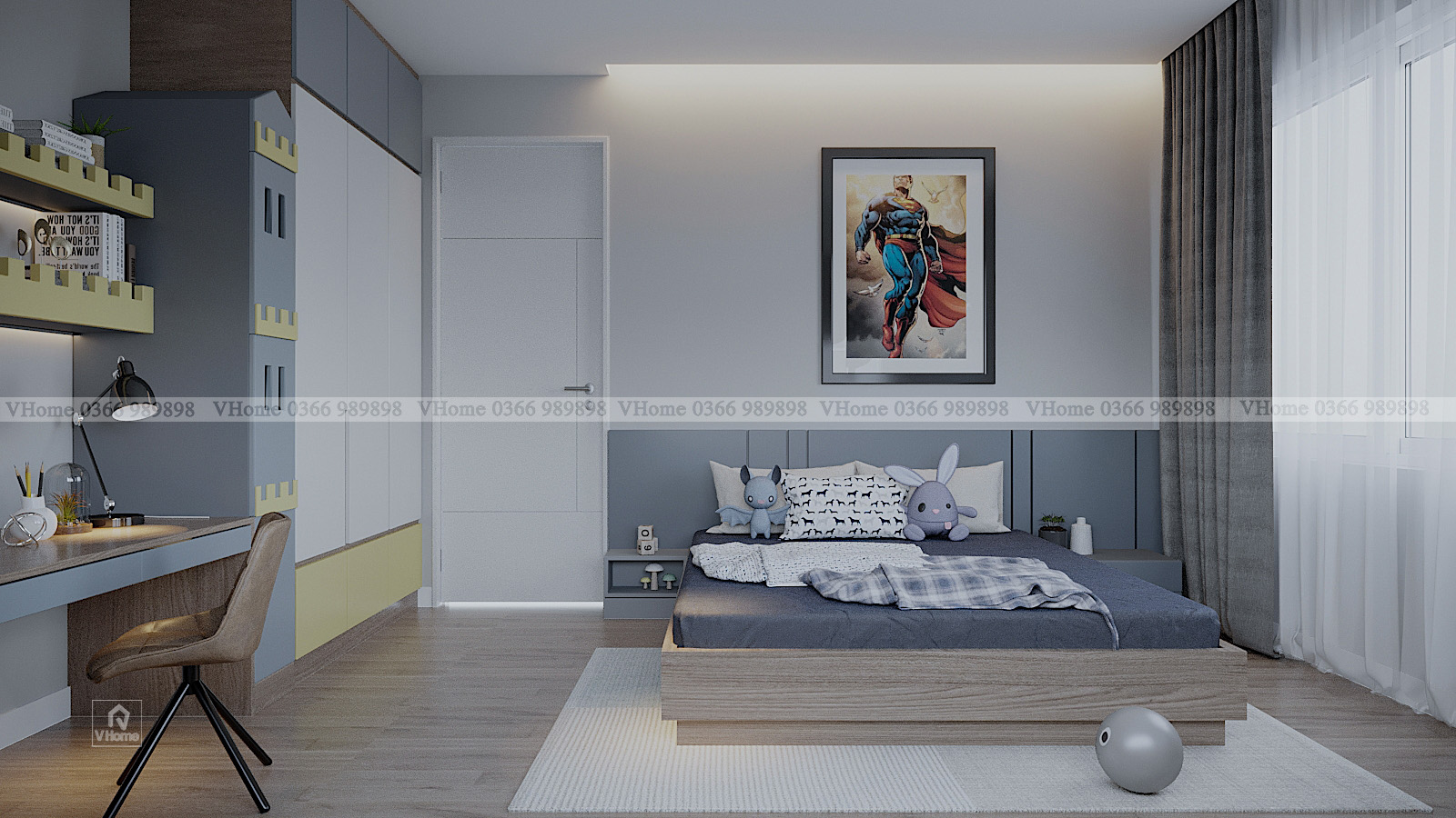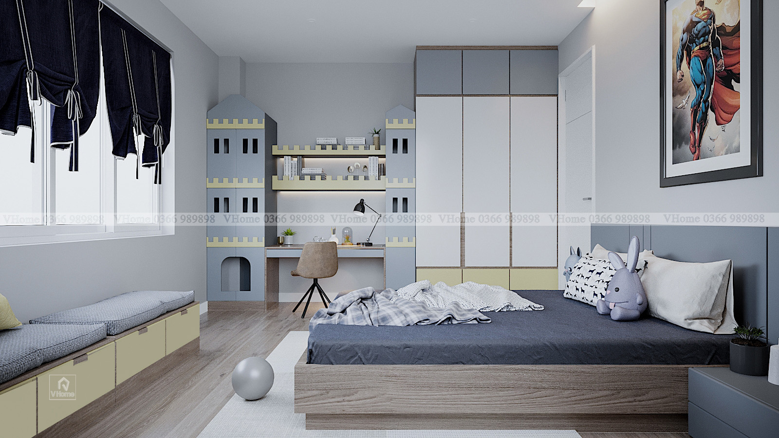 Phòng ngủ bé trai với tông xanh nam tính, mạnh mẽ